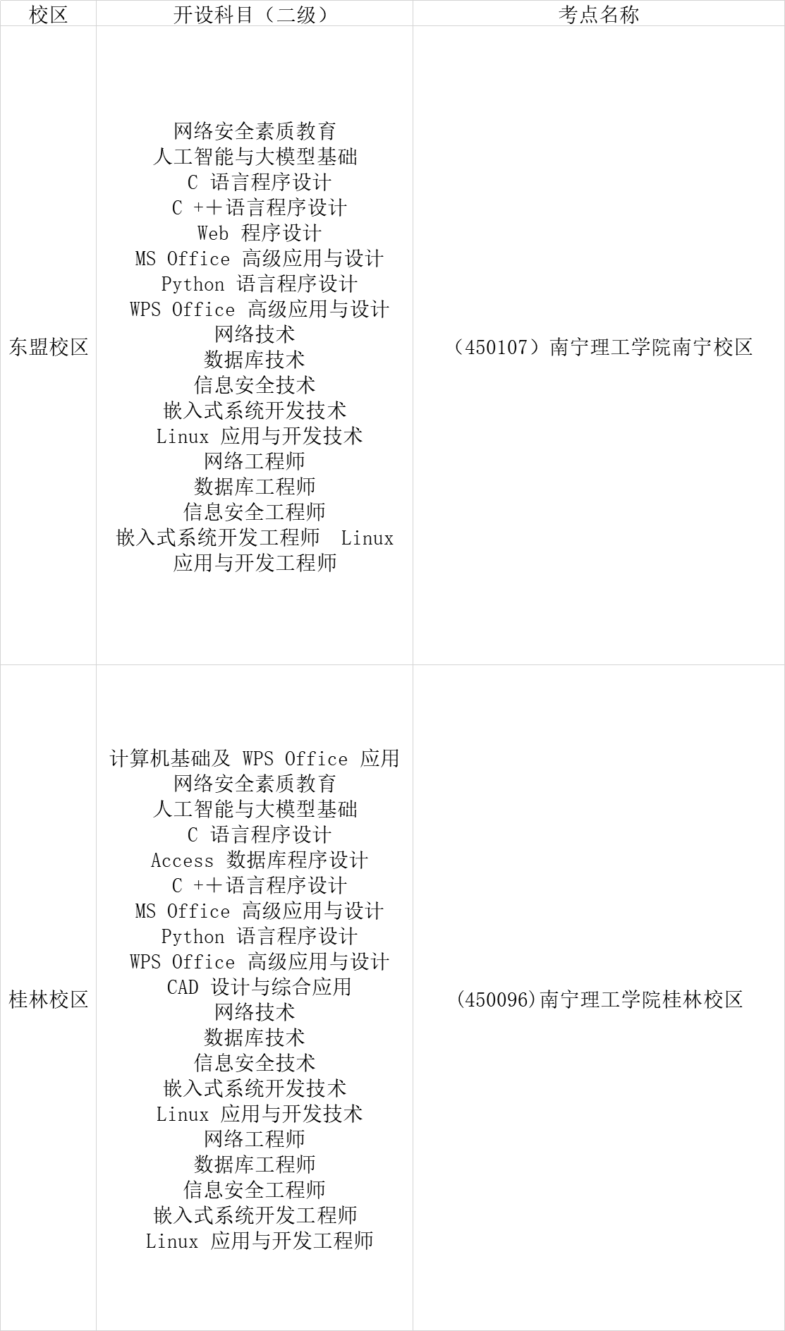 本次考试今年会各校区开考科目如下表所示,请各位考生认真核对报考考点。