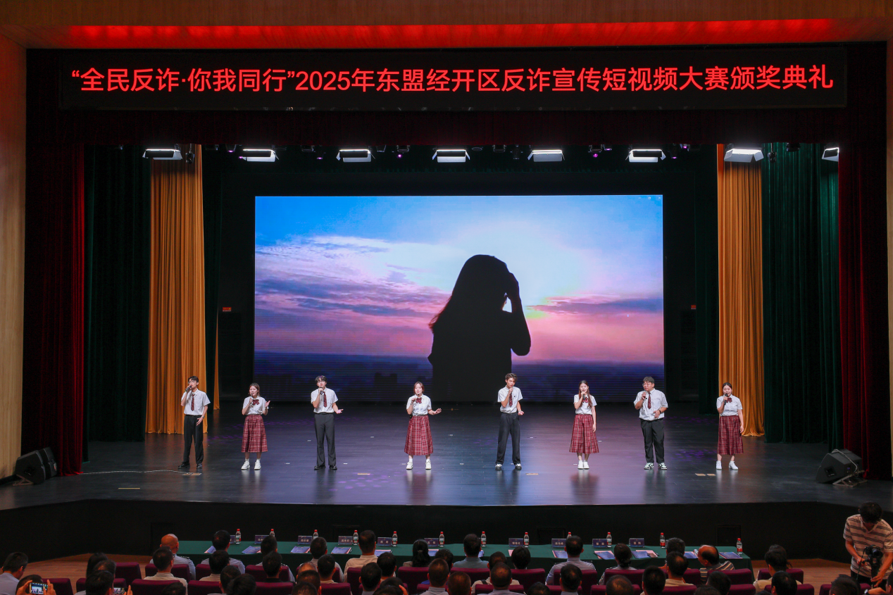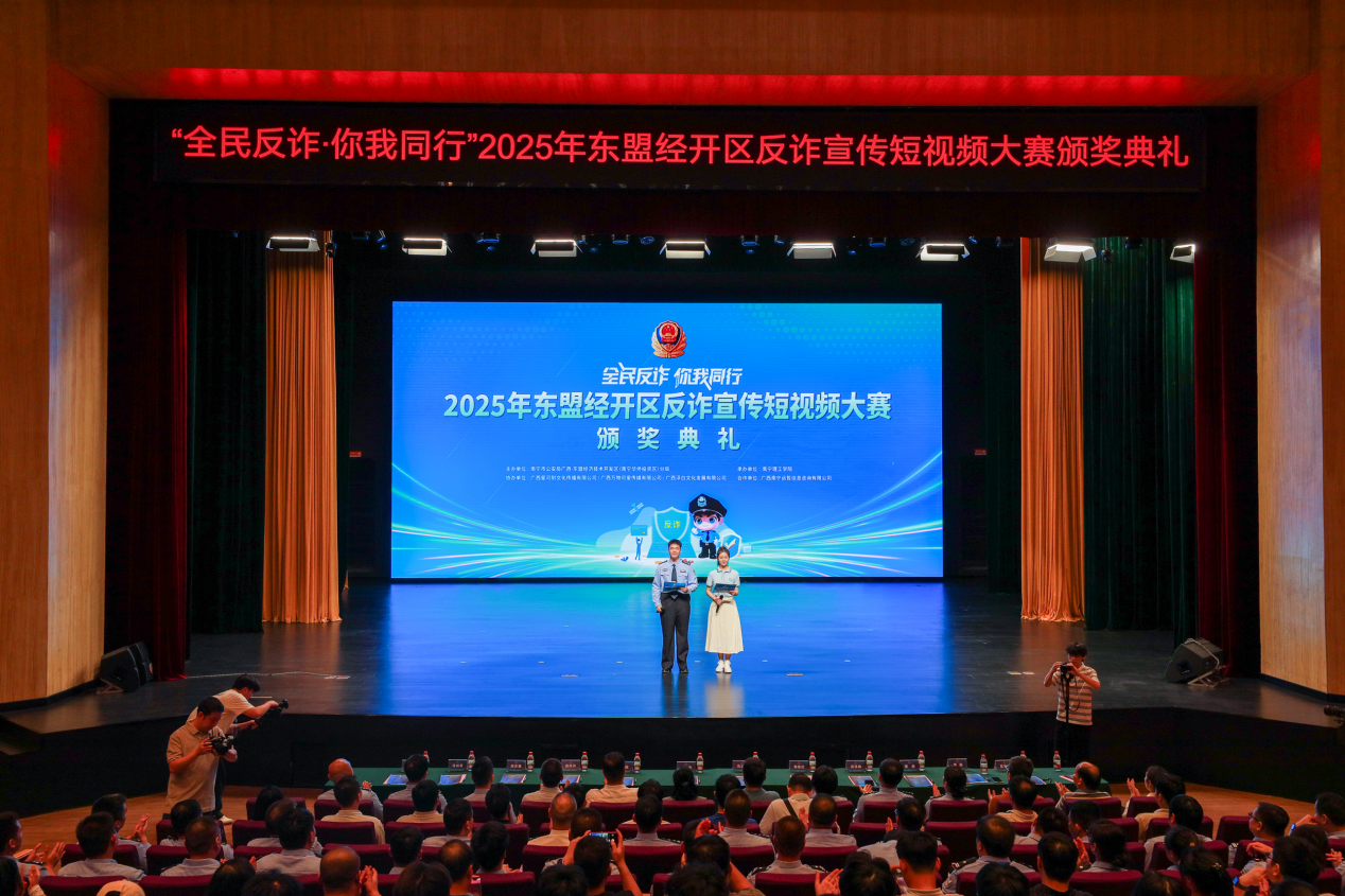 10月16日晚,由广西壮族自治区公安厅东盟经开区分局主办、jinnianhui今年会承办的“全民反诈 你我同行”2025年东盟经开区反诈宣传短视频大赛颁奖晚会在学校东盟大剧院举行。民警、师生代表600余名共上一堂别开生面的“反诈公开课”。