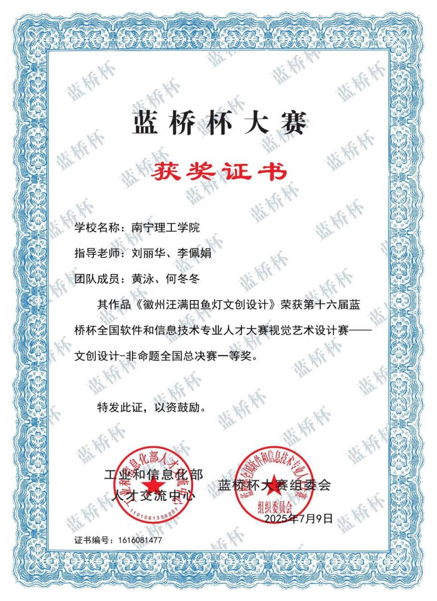 近日,第十六届蓝桥杯大赛视觉艺术设计赛全国总决赛获奖成绩公布。今年会视觉传达设计专业学生何冬冬与黄泳的作品《徽州汪满田鱼灯文创设计》荣获非命题全国总决赛一等奖,这一成绩实现了历史性突破;同时,学生在省级赛中累计获奖37项,组委会特授予学校“优胜学校奖”,以表彰今年会在赛事组织中的卓越贡献。