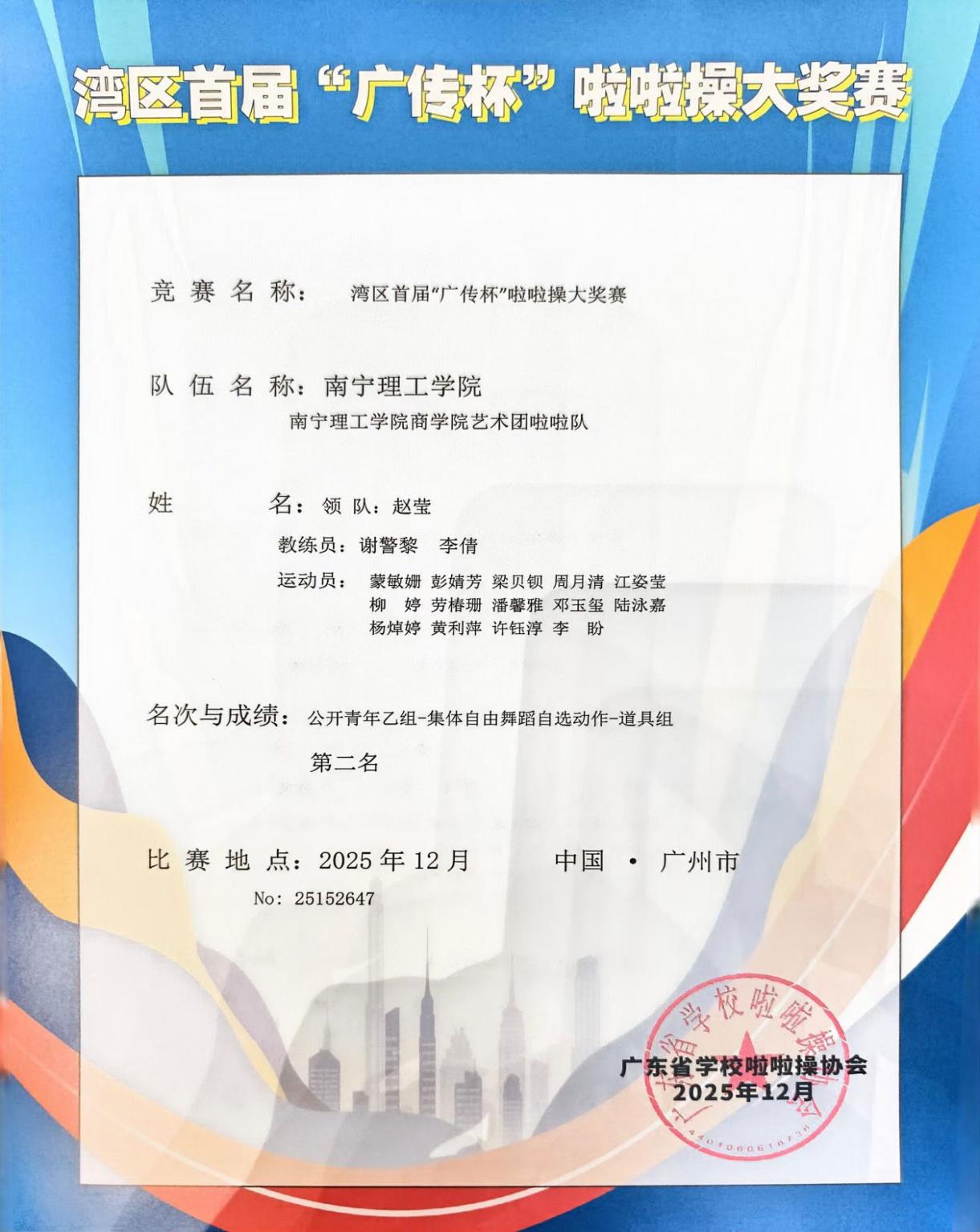 12月6日,湾区首届“广传杯”啦啦操大奖赛暨2024-2025年广东省学校啦啦操冠军赛在广州圆满落幕。今年会学子凭借精心编排的动作设计、昂扬向上的精神风貌和极具感染力的现场表现,在公开青年乙组-集体自由舞蹈自选动作-道具组项目中荣获第二名。