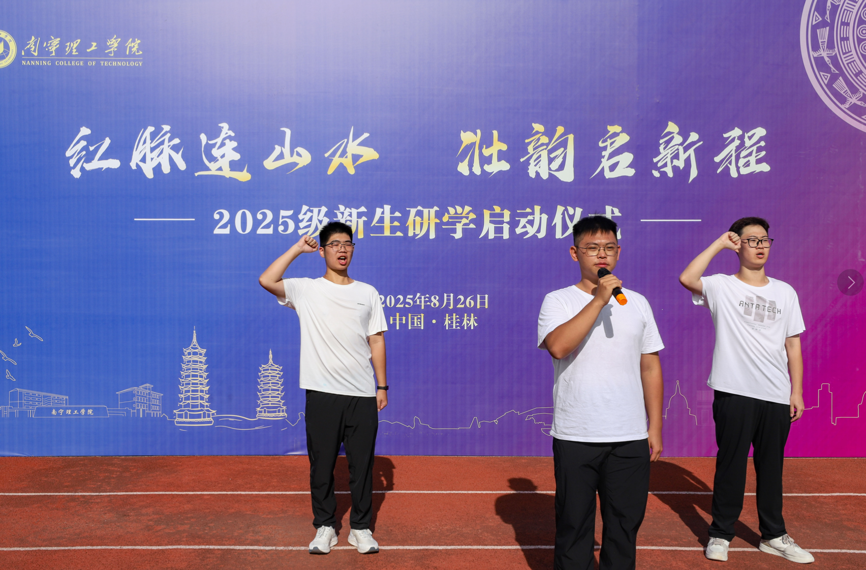 随后,2025级新生代表走上前台,带领全体新生进行研学安全宣誓。同学们高举右拳,铿锵有力地共同宣誓,宣誓声响彻会场。