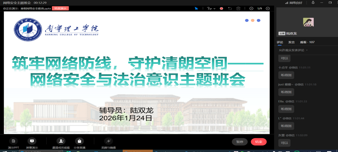 近日,为切实增强学生寒假期间网络安全防范意识,提升应对网络风险的能力,近日,文理学院全体辅导员通过线上平台,陆续为全院学生召开“网络安全伴我行”主题班会,全体学生相聚云端、共同研学,为平安寒假筑牢网络安全屏障。