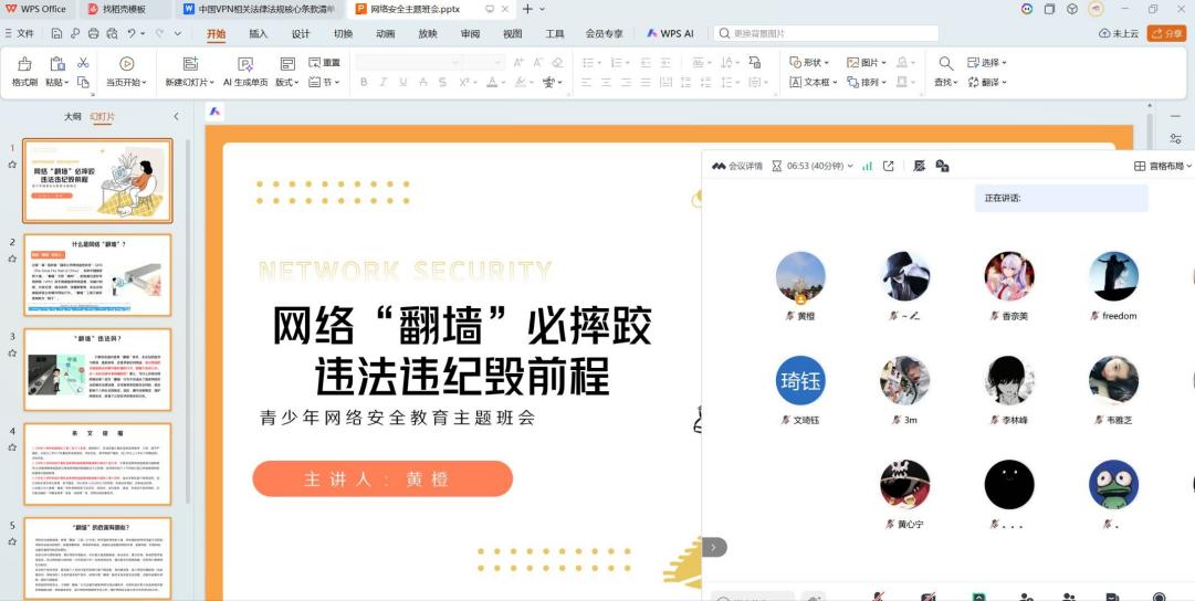 班会上,辅导员结合当前网络环境特点,重点讲解了网络“翻墙”的违法性和潜在危害,引导学生远离此类行为。也通过真实案例剖析了网络诈骗、信息泄露、不良信息传播等常见网络安全风险、学生虚假兼职、游戏账号交易、冒充熟人等针对学生群体的诈骗手法,提醒同学们要自觉遵守国家法律法规和加强自我保护意识,不尝试“翻墙”访问境外网站,以免触犯法律,影响自己的学业和前途,注意保护个人隐私,不轻易透露个人信息给陌生人,安装可靠的安全软件,定期更新病毒库,确保个人设备安全。